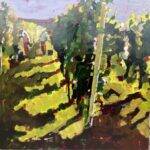 Vineyard laborers rendered as clustered forms amid rows of green-gold vines. Wade’s oil paint captures tactile vine foliage through thick, directional strokes; figures merge with vegetation, emphasizing work’s integration into landscape rather than dominance over it.