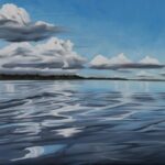 Reflective surface activates the composition, doubled forms creating shallow pictorial space. Oil’s working properties—its resistance, its gloss—participate in representing water’s optical properties.