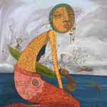 Unfathomed, a captivating work by Denise Duong, invites viewers to step into a whimsical world of dreamlike proportions. This mixed media on canvas piece, measuring, transports the observer to an underwater realm where a mermaid figure reigns supreme, surrounded by an array of maritime and nature elements. The golden yellow, coral red, deep blue, sage green, and cream white hues blend in perfect harmony, evoking a contemplative mood that beckons the viewer to linger. What makes Unfathomed truly unique is the way Duong masterfully weaves together disparate elements to create a cohesive, surreal narrative that is at once fantastical and thought-provoking. As part of the JG Art Gallery collection, this piece is a testament to the gallery’s commitment to showcasing innovative and captivating works. For those who appreciate figurative surrealism, Unfathomed is a must-see, and acquiring this piece would be a valuable addition to any serious art collection, or visit us at JG Art Gallery to experience it in person.