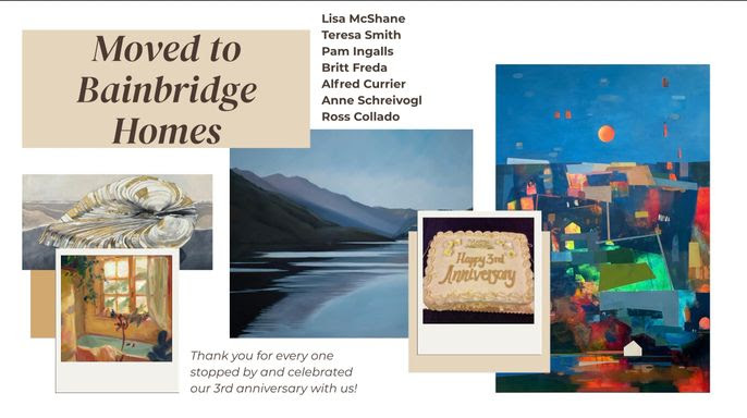 ”Annual Celebration Show” Large art works exhibition includes fresh artwork from your gallery favorites. The show has been moved next door to Bainbridge Homes. Be sure to pop in and see this extraordinary artwork.
