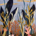 Mixed media collage. A periwinkle-blue ground; a horizontal band of gold leaf marks the water surface; black silhouetted seagrass and kelp rise from below; ochre and cream coral forms anchor the lower register. Ferron applies gold leaf as structural line, not ornament — it divides the composition into above and below. The shapes are cut and placed with the precision of quilting. Salish Sea Dreams series. Lopez Island studio. $2,000. International shipping available.