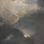 The composition balances brooding dark grays and deep charcoals against luminous cream whites and soft blues, while warm beige tones suggest light breaking through turbulent clouds. Juvonen’s technique creates a tangible sense of moisture and movement in the air, as if you can feel the lingering energy of the passing tempest. The painting’s emotional resonance lies in this duality—the lingering tension of what has passed paired with the subtle promise of clearing skies.