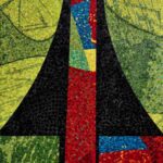 The piece radiates raw power through its bold palette of lime green, black, red, blue, and yellow, arranged in a carefully orchestrated geometric form that suggests a figure in motion. The interplay between the smooth painted elements and the tactile mosaic detailing creates a visual rhythm that feels both modern and timeless, evoking a sense of strength, resilience, and spiritual presence.