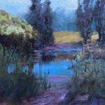 Wallis applies oil in layered strokes to render the pond’s surface as a field of reflected sky and shoreline vegetation. The composition flattens depth, emphasizing the water’s materiality over illusionistic space.