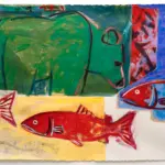 Le Van renders animal form through accumulated paint and ink application on paper. The bear-salmon pairing suggests predatory encounter; technique emphasizes surface texture and gestural urgency rather than naturalistic rendering.
