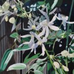 Neal Philpott’s “Bigger Blooms” is a luminous celebration of nature’s delicate extravagance, rendered in oil on canvas with masterful restraint and vibrant sensibility. This floral composition showcases clematis flowers in full, radiant glory, their ruffled petals rendered with remarkable three-dimensional presence. Philpott’s brushwork captures the interplay of light across the blossoms while the surrounding vines and foliage create an organic architectural framework that grounds the composition in natural authenticity.