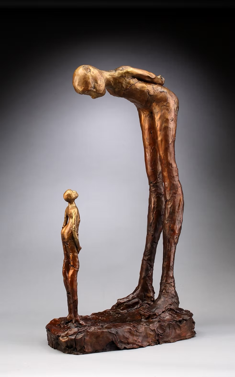Acott’s bronze abstracts the human form into angular, interlocking planes. The work’s tension derives from geometric compression rather than illusionistic modeling, presenting internal states through formal constraint.