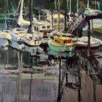 Acrylic on panel allows Wallis to work boats and dock structures with clean edges and matte surfaces. The composition anchors vessels in harbor space without atmospheric softening.