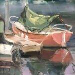 Oil paint builds fog through warm grays and muted blues, obscuring the docked boat’s details. The limited palette and soft-edged forms suggest weather’s opacity rather than haze as mood.