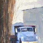 Oil on canvas — impasto. A vintage flatbed in cerulean blue and cream occupies the center, framed by weathered walls — raw sienna and burnt umber left, neutral grey right. Knife-applied highlights mark the cab and chassis. A small aircraft silhouette marks the pale sky. Currier applies the same color-temperature discipline to an industrial subject as to the tulip fields — the truck is as structurally organized as a landscape. Oil on canvas. $950. International shipping available.