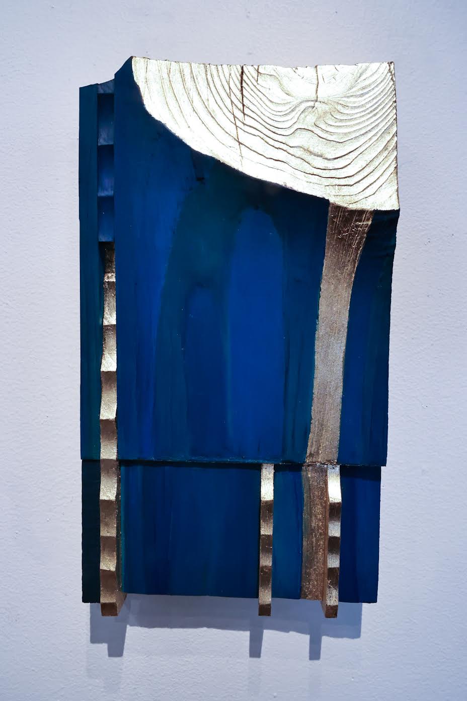 Gold leaf and wood support acrylic application on panel in McConnell’s largest work of the series. Metallic accents function as compositional anchors while introducing material hierarchy, though their decorative potential is tempered by restrained formal arrangement.