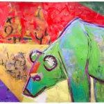 Mixed-media layering on paper produces a green-field composition where animal form emerges through translucent glazes and opaque marks. The technique prioritizes material visibility—visible brushwork and ink washes construct rather than depict the figure.