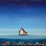 Marketa Sivek’s “Happy Barn, Night in Beautiful Fields” is a transcendent meditation on belonging and displacement rendered in luminous oil paint. The composition presents a solitary barn structure suspended impossibly above an undulating ocean, bathed in the ethereal glow of a crescent moon. This surrealist landscape defies gravity and logic while maintaining an unexpected warmth, inviting viewers into a dreamscape where the terrestrial and celestial merge seamlessly.