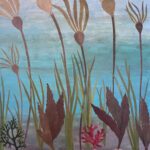 Mixed media collage on canvas. An underwater scene built from layered paper and acrylic: seagrass stems in ochre and olive rise vertically, topped with seed pods in burnt sienna and tan. The background transitions pale gray-blue above to deeper blue below — depth by value shift, not perspective. Ferron’s Salish Sea Dreams series draws from the marine environment around Lopez Island. The forms are botanical but could be coral; the ambiguity is deliberate. $2,250. International shipping available.