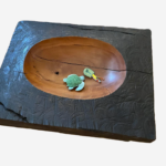 Mixed media — salvaged wood, carving, and textile. A rectangular dark wood base with linear incisions across the surface; an elliptical cavity carved into the upper face reveals smooth burnt sienna interior. A small green crocheted turtle with turquoise felt flippers sits in the carved bowl. The combination is McConnell at his most open: the hard material and the soft one, the ancient wood and the handmade object, placed in conversation. $900. International shipping available.