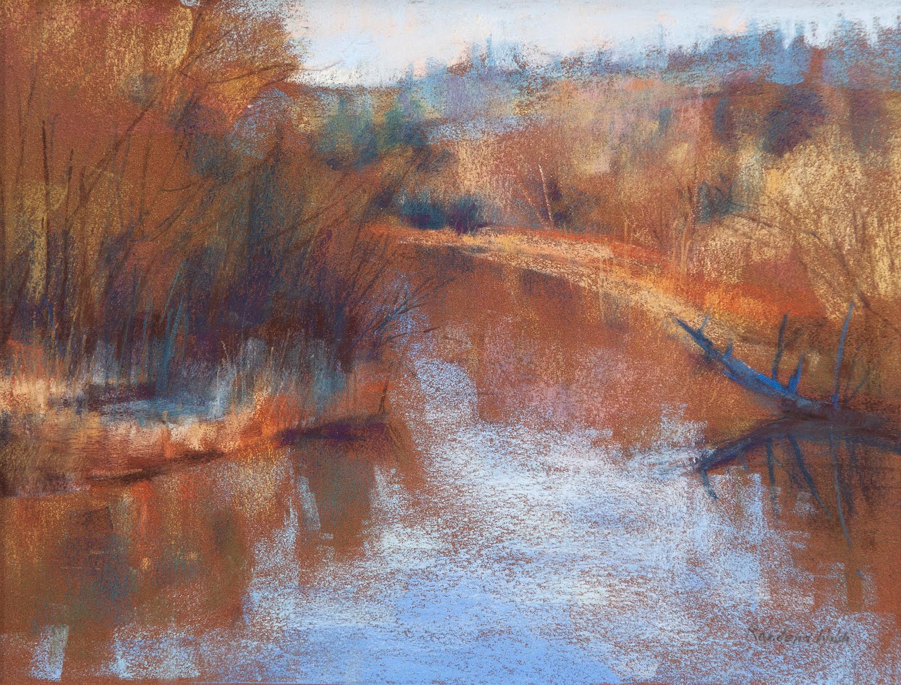 Walsh’s pastel work presents a compositional pause—landscape reduced to essential forms. The medium’s inherent softness registers as formal restraint rather than atmospheric suggestion, with color relationships establishing spatial depth.