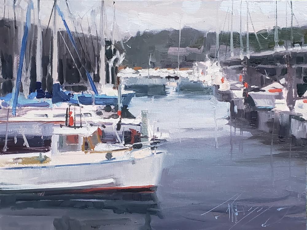 Marina infrastructure—docks, moorings, water—composed with geometric clarity. Weiss negotiates the potential picturesque through disciplined structure and restrained palette application. Oil on canvas, 9 x 12 in.