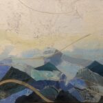 Mixed media collage. Ferron layers topographic maps and aerial imagery with cerulean and prussian blue watercolor washes; cut-paper mountain silhouettes in raw umber and ochre rise above the cartographic ground. Maps have been a recurring material in her practice since the MapScapes series — not as decoration but as substrate, layered beneath painted and cut forms. Navigation as literal fact, then visual field. $3,250. International shipping available.