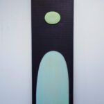Mixed media on salvaged cedar. A vertical rectangular panel in dark wood. Two forms: a small pale lime-green circle positioned in the upper third, a large arch in pale turquoise fading to cream at the base below. Each form holds its space without competing. McConnell’s formal logic — Calder and Tobey cited as influences — is visible here: the smaller element above, the larger below, the horizontal grain running behind both. $1,200. International shipping available.