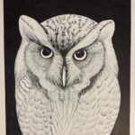 Ink pen and graphite delineate the owl’s anatomical specificity—feather pattern, orbital sockets—with botanical precision. The line itself carries meaning.
