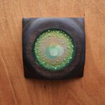 Mixed media on salvaged cedar. Square cedar, horizontal grain in dark brown throughout. Concentric circles in olive green, pale yellow-green, and cream. Small sage-green dots radiate outward from the center rings. Smooth acrylic application over carved wood. The Portal series examines the circle as a threshold — here in earth tones, the opening reads as ground rather than sky. $600. International shipping available.