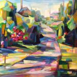 Brooke Borcherding’s *Road to Home 2* captivates with its compelling fusion of urban narrative and abstract geometric vision. This oil on canvas work transforms an ordinary street scene into a dynamic composition where architectural forms dissolve into rhythmic planes of color and movement. The artist’s confident brushwork reveals a mastery of light and shadow, creating luminous passages that guide the viewer’s eye through layered urban geometry.