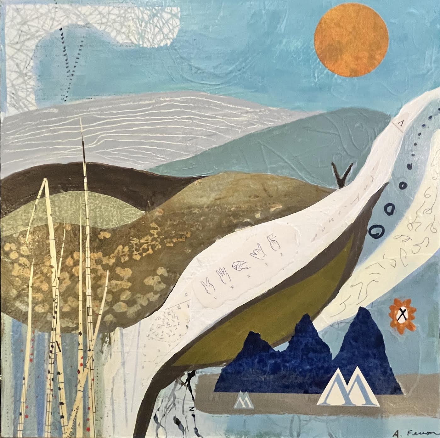 Mixed media collage. Ferron layers painted and found paper elements — the material vocabulary of her Salish Sea and garden series applied to a quieter register. Hard-edged forms; the composition resolves into individual shapes before it resolves into a subject. Lopez Island, WA. Exhibited at Anacortes Art Festival. $450. International shipping available.