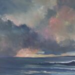 Acrylic pigment applied in broad, gestural strokes depicts stormy offshore conditions. The composition privileges weather’s visual drama over settled landscape description.