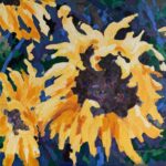 Sunflower’s disk built from concentric circular strokes in yellow-white. Petals extend outward in tapered marks, stem rendered with single assertive green line.