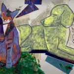 Paint, ink, and collage create layered animal presences on paper where tabby cat and yellow dog occupy shared pictorial space. Technical layering produces visual tension between discrete figures; materials remain assertively visible throughout.