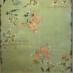 The canvas blooms with a harmonious palette of soft greens, warm golds, and delicate rose tones that seem to breathe across the surface. The composition draws viewers into a garden sanctuary where nature’s gentle abundance creates an atmosphere of peaceful reverie. Fraga’s masterful application of oil paint allows colors to meld and dance together, creating luminous depths that reward prolonged viewing. Her brushwork suggests rather than defines, inviting the viewer’s imagination to complete the narrative.