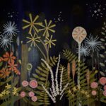 Mixed media collage. Ferron builds a dark navy ground and cuts botanical forms in layers above it: orange and coral flowers at the composition’s base, pale pink circular blooms, white star-shaped blossoms, golden-yellow geometric heads throughout. Hard-edged — scissors and X-acto knives, not a brush. The shapes read like Rousseau’s jungle: each plant individual, specific, pressed into an impossible togetherness. Ferron’s quilting background is visible in how the pieces fit. $4,750. International shipping available.