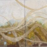 Mixed media collage — two panels. Topographic maps and weathered papers form the base; translucent tan and cream-colored ribbons undulate across the surface. Cerulean blue dots punctuate the lower left; raw umber, ochre, and cadmium yellow dominate the earth-toned palette. The ribbon forms — cut from paper, not painted — read as both wind and contour line. Exhibited at Washington State Convention Center and Seattle City Hall. $2,750. International shipping available.