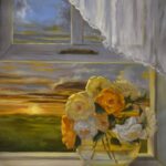 Through The Window, a captivating oil on canvas piece by Raenell Doyle, invites viewers to step into a serene and romantic world. As the eye wanders through the composition, it’s drawn to the delicate flowers in a vase, sitting gracefully on a windowsill, with a breathtaking landscape unfolding outside. The warm, golden light and soothing colors, including creamy whites, soft grays, and sky blues, evoke a peaceful and contemplative mood, making this piece a true masterpiece of still life with landscape. The artist’s use of color and light creates a sense of depth and dimensionality, making the scene feel almost tangible. Measuring, this piece is a significant addition to any art collection. At JG Art Gallery, we are proud to showcase Doyle’s work, and we invite you to experience the beauty of Through The Window for yourself, either by acquiring this stunning piece or visiting us at our locations in Bainbridge Island, WA, or Park City, UT.