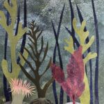 Mixed media collage. An underwater composition that includes chartreuse and ochre saguaro cactus forms, tall navy vertical plant shapes, a burgundy sea creature in the lower register — Ferron collapses marine and desert environments deliberately, in the tradition of Rousseau’s impossible jungles. Speckled gray-green background reads as either sand or turbid water. This ambiguity between ecosystems is characteristic of her practice. $500. International shipping available.