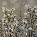 Acrylic and mixed media. A garden viewed from an elevated angle — dark navy and olive stems ascend vertically; white star-shaped flowers open throughout; spherical forms in periwinkle blue and cream read as seed heads. Ferron flattens the perspective deliberately: influenced by Rousseau’s insistence on the picture plane over depth illusion. The silver light in the title is a temperature, not a brightness. Lopez Island, WA studio. $4,000. International shipping available.