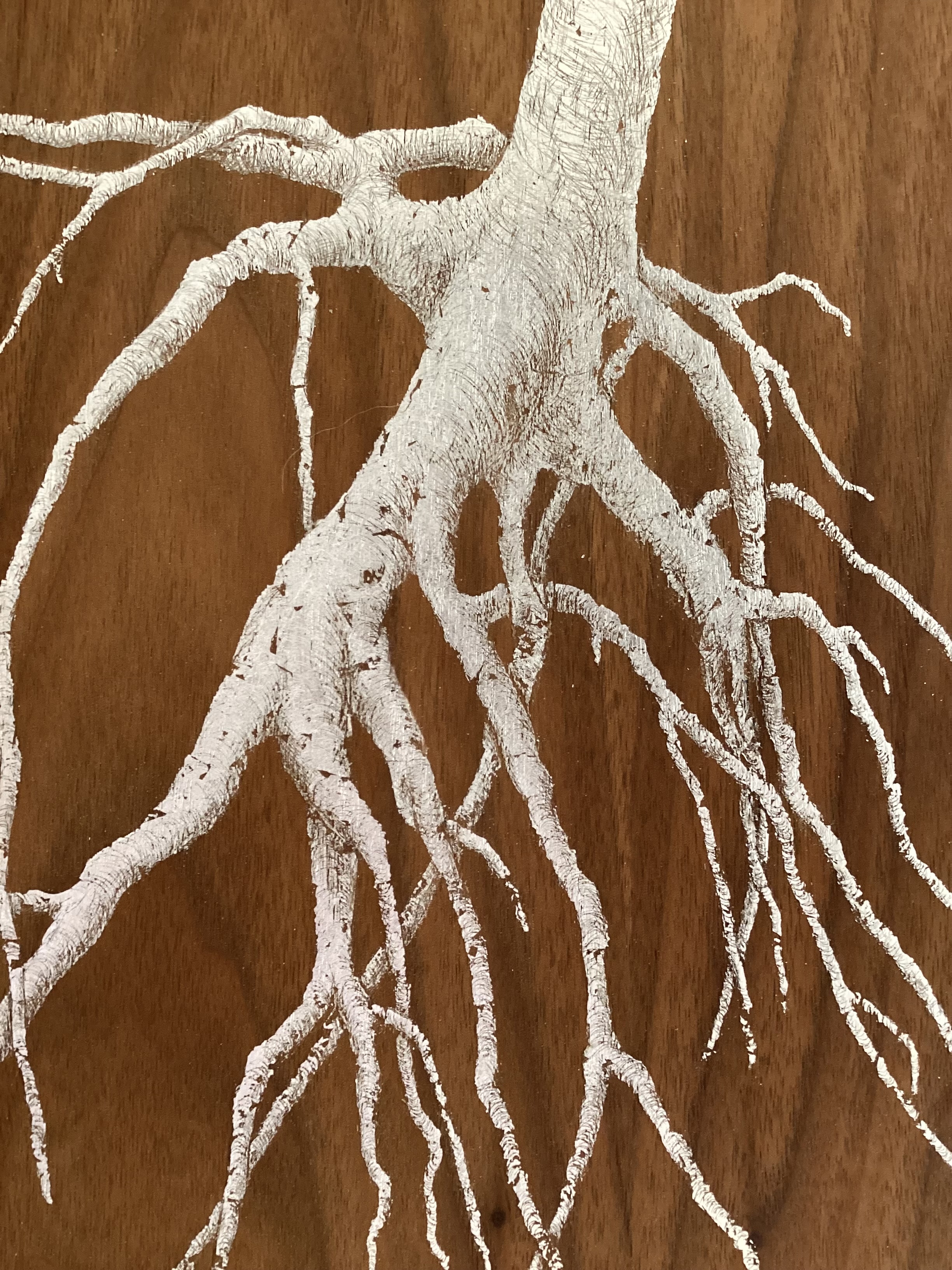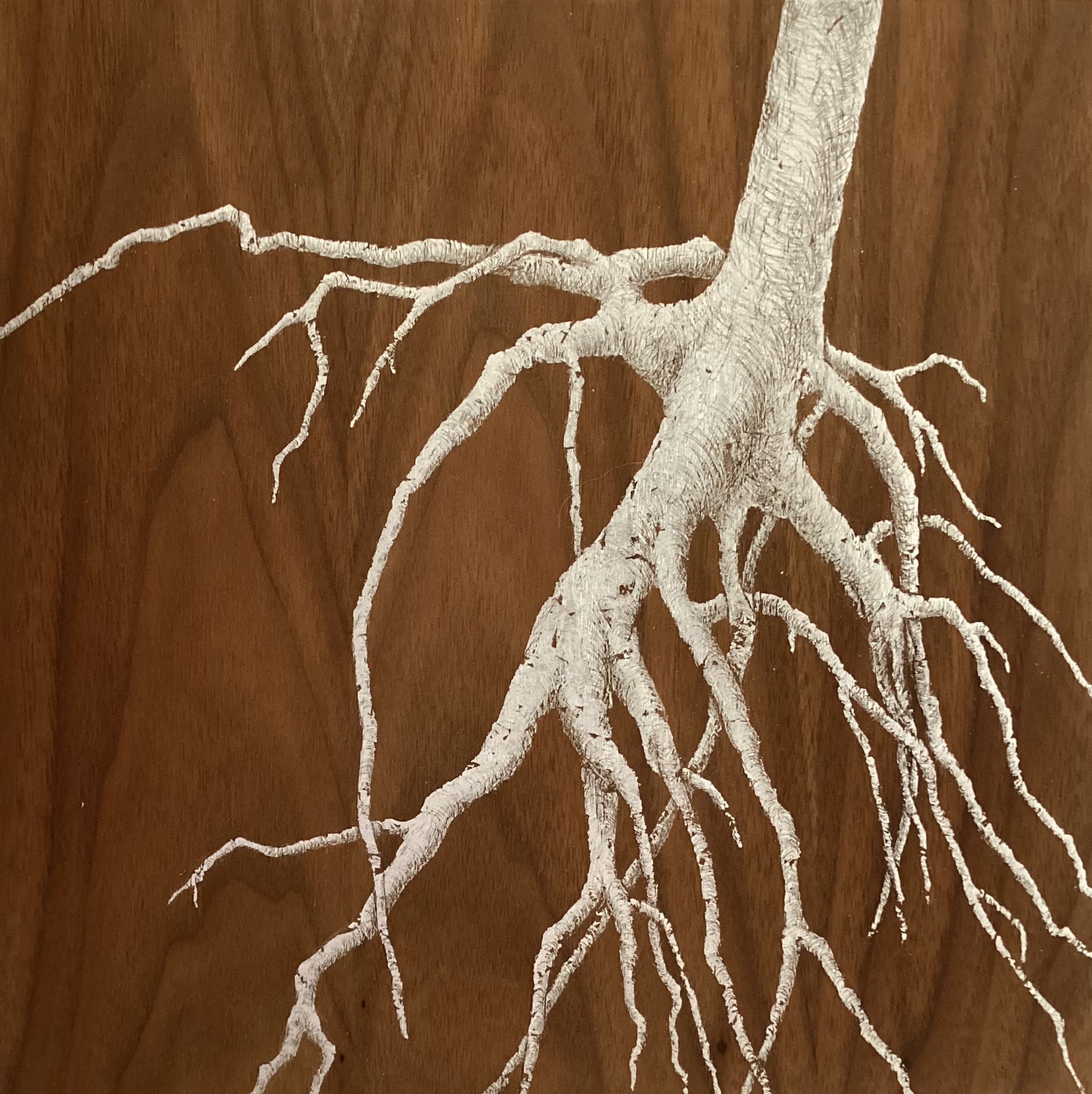 Mann combines walnut veneer with silver leaf on wood panel, establishing visual tension between natural material warmth and metallic reflection. The work engages modernist reduction while acknowledging craft tradition through material specificity.