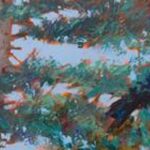 Oil on canvas — impasto. Two blue-black birds perch on a gnarled branch among viridian, cadmium yellow, and burnt sienna foliage. Golden ochre accents read as blooms. The pale cerulean sky is the only open space. The birds are precisely rendered; the surrounding foliage is gestural — Currier’s consistent approach: the subject is specific, the context is loose. An entry into his bird series at a collector-accessible price. Oil on canvas. $3,200. International shipping available.