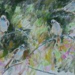 Colored pencil permits Walsh precise linework in the sparrows’ plumage—crown stripes, throat patches rendered with tight hatching. The technique’s inherent brittleness registers each bird’s alertness against neutral ground.